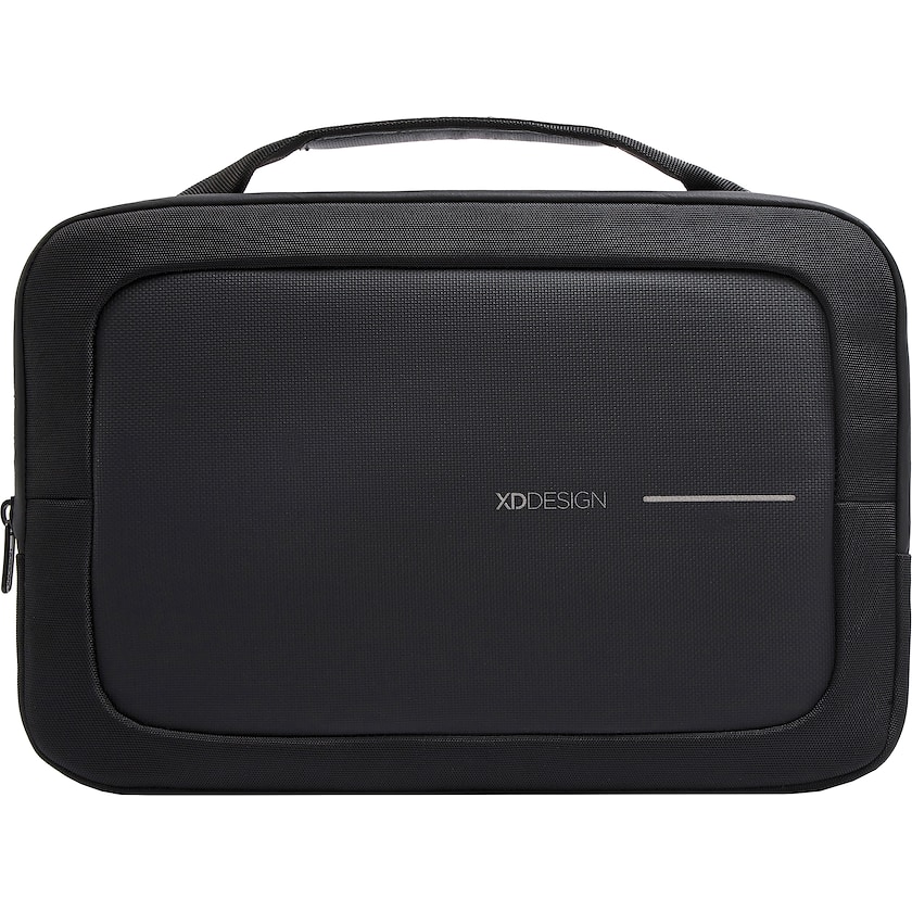 Moderne Computertasche für einen 16"-Laptop. Der wasserabweisende Stoff ist aus rPET, also aus recycelten PET-Flaschen, hergestellt. Das Futter ist aus weichem Fleece.