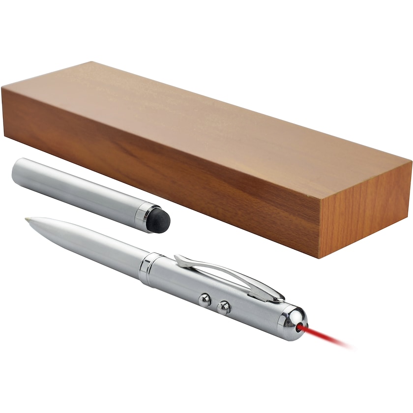 Laserpointer mit Kugelschreiber, Touchfunktion und Taschenlampe. Lieferung in eleganter Holzschachtel. Markierung erfolgt mit Lasergravur auf dem Laserpointer. Der Laserpointer ist mit einem Warnhinweis gemäß EU-direkt 2006/25/EU versehen.