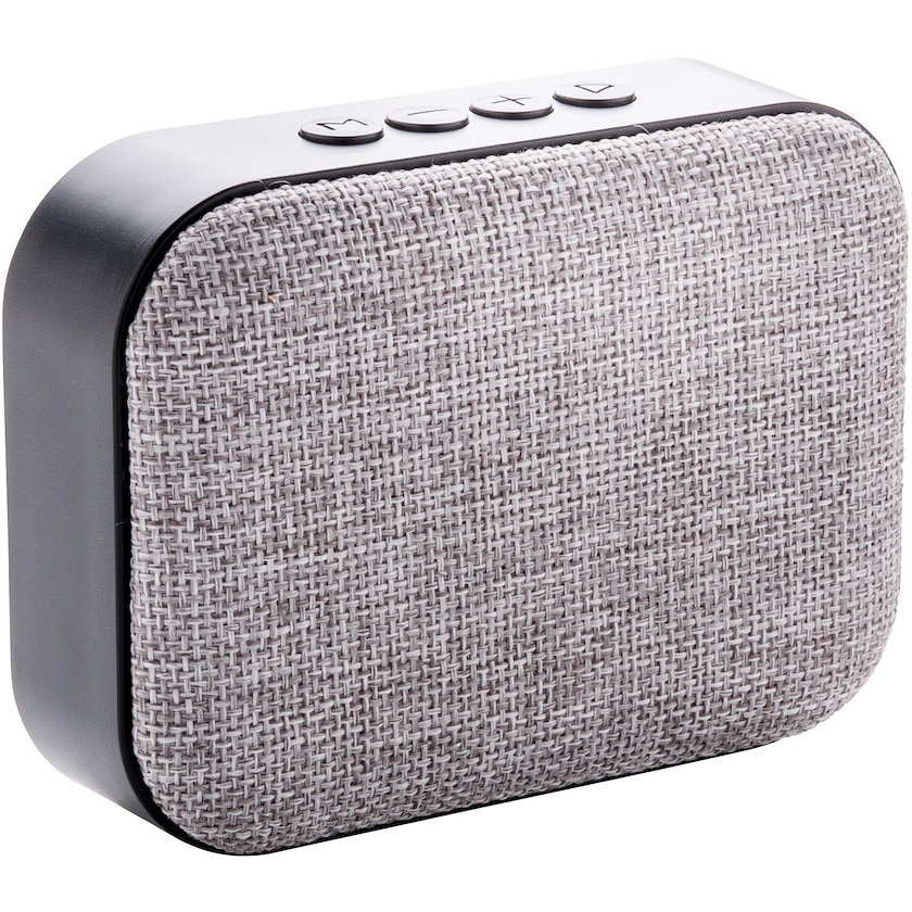 Moderner Bluetooth-Lautsprecher vorne mit grauem Stoff. Der Akku hält bis zu 3 Stunden pro Ladung und der Lautsprecher hat eine Reichweite von 10 m. Mikro- und Audiokabel sind im Lieferumfang enthalten. Der Druck erfolgt auf dem Stoff auf der Vorderseite des Lautsprechers.