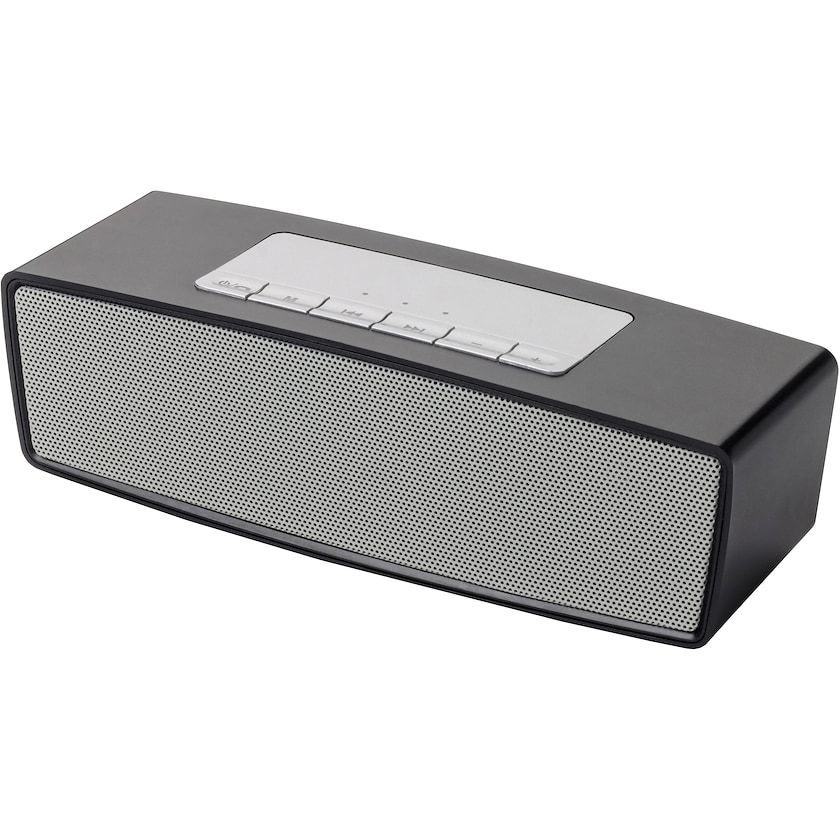 Günstiger Bluetooth-Lautsprecher mit elegantem Design. Der Lautsprecher hat vieler veschiedenen Anschlussmöglichkeiten. Neben Bluetooth können auch an AUX-Kabel, MicroSD-Karte und USB-Stick angeschlossen werden. Der Lautspecher hat ein eingebautes Radio und kann auch als Freisprecheinrichtung genutzt werden. Das Produkt ist CE-zertifiziert. Das Logo wird mit 4-Farb-Fotodruck auf dem Lautsprechergitter aufgedruckt.
