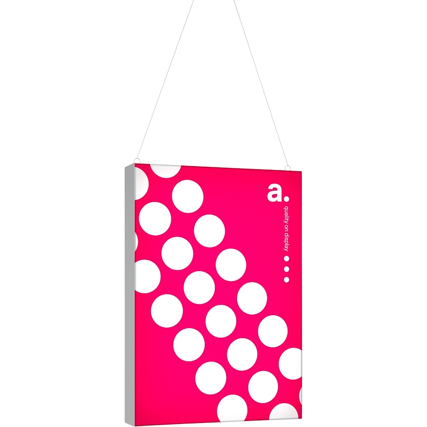 Kleiner Leuchtkasten, der von der Decke hängt. Der Leuchtkasten wird von einem hochmodernen LED-Lichtsystem beleuchtet, das garantiert, dass das gesamte Motiv beleuchtet wird. Das Motiv wird mit einem speziell entwickelten Druckverfahren, das für scharfe Details und leuchtende Farben sorgt, auf ein Polyestergewebe gedruckt. Das Motiv wird auf beiden Seiten des Leuchtkastens angebracht. Wenn es an der Zeit ist, das Motiv zu ersetzen, bestellen Sie einfach einen neuen Stoff bei uns.