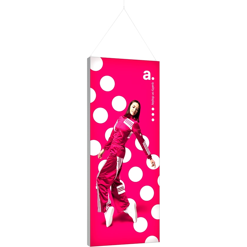 Ein riesiger Leuchtkasten, den man von der Decke hängt. Perfekt für Messen! Der Leuchtkasten ist mit einem hochmodernen System von LED-Leuchten ausgestattet, die das gesamte Design von den Seiten beleuchten. Ihr Motiv wird mit einem speziellen Druckverfahren, das scharfe Details und leuchtende Farben erzeugt, auf ein Polyestergewebe gedruckt. Das Motiv wird auf beiden Seiten des Leuchtkastens angebracht. Wenn Sie das Motiv in Zukunft erneuern möchten, bestellen Sie einfach einen neuen Stoff bei uns.