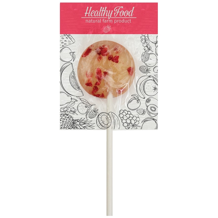 Veganer, umweltfreundlicher Lutscher, reich an Fruchtstücken Stiel und Verpackung des Lutschers bestehen zu 100 % aus abbaubarem Material. Die richtige Wahl für alle diejenigen, die einen umweltfreundlichen Lutscher mit bedruckbarer Folie suchen.