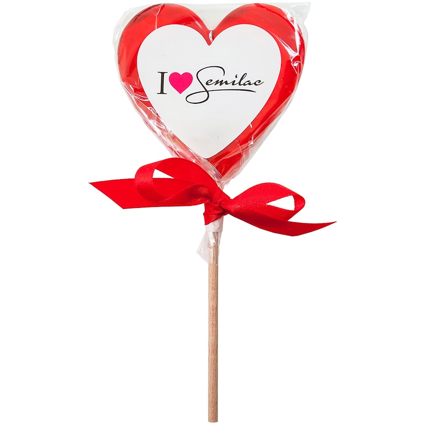 Großer herzförmiger Lutscher mit 70 g Gewicht. Der Druck erfolgt auf einem herzförmigen Etikett auf der Kunststofffolie. Die Folie wird mit einem roten Band verschlossen.