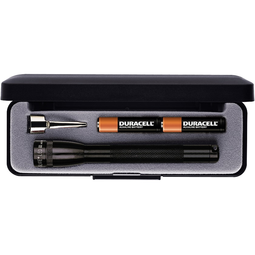 Die klassische Minimag-Taschenlampe. Mit Geschenkschachtel und Batterie. Die Taschenlampe hat eine Glühbirne.