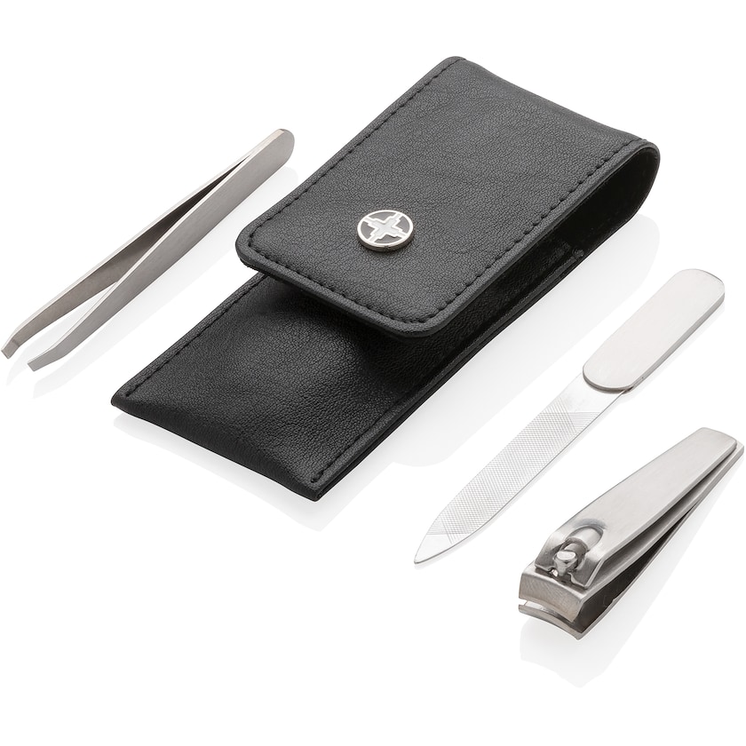 Kleines Maniküre-Set von Swiss Peak. Das Set besteht aus 3 Teilen. Alle Teile wurden aus hochwertigem Edelstahl gefertigt. Das Druckmotiv wird per Gravur auf die Kunstleder-Außenschicht des Aufbewahrungs-Etuis aufgetragen.