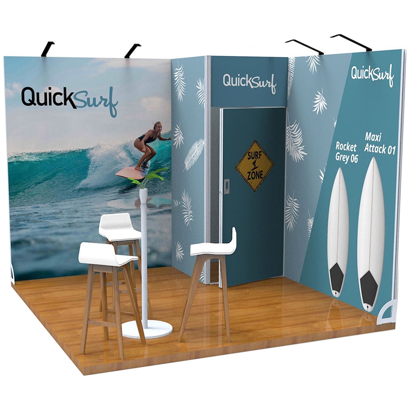 Leicht aufzubauender Messestand mit 9 m2 Im Set sind zwei 200 cm Module, ein Modul mit Tür, zwei Füße und eine Aufbewahrungstasche enthalten. Der Druck erfolgt auf einem Stoff, der über den Rahmen der Module gespannt und mit Silikonband fixiert wird. Die Modulrahmen bestehen aus eloxiertem Aluminium. Um einen schnellen Zusammenbau zu ermöglichen, sind alle Teile eindeutig gekennzeichnet. Für die Montage ist außer dem mitgelieferten Inbusschlüssel kein weiteres Werkzeug erforderlich. Wenn Sie den Aufdruck auf dem Ständer ändern möchten, bestellen Sie einfach neue Stoffe bei uns. Als Zubehör können LED-Leuchten und TV-Ständer erworben werden. Tische, Stühle und Böden sind nicht im Lieferumfang enthalten.