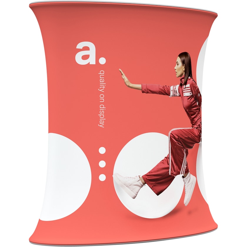 Stabilen und sehr flexiblen Ausstellungstisch nach Wunsch bedrucken. Arc Oval hat eine robuste Konstruktion aus Aluminiumrohren, die mit Polyestergewebe bespannt sind. Die Platte besteht aus MDF. Der Tisch lässt sich leicht zusammenbauen, indem die Silikonnaht des Gewebes am System befestigt wird, wodurch eine nahtlose Konstruktion entsteht. Bei Bedarf kann der Stoff separat bestellt werden, um das Design des Tisches zu erneuern. Wird in einer eleganten Aufbewahrungstasche geliefert.