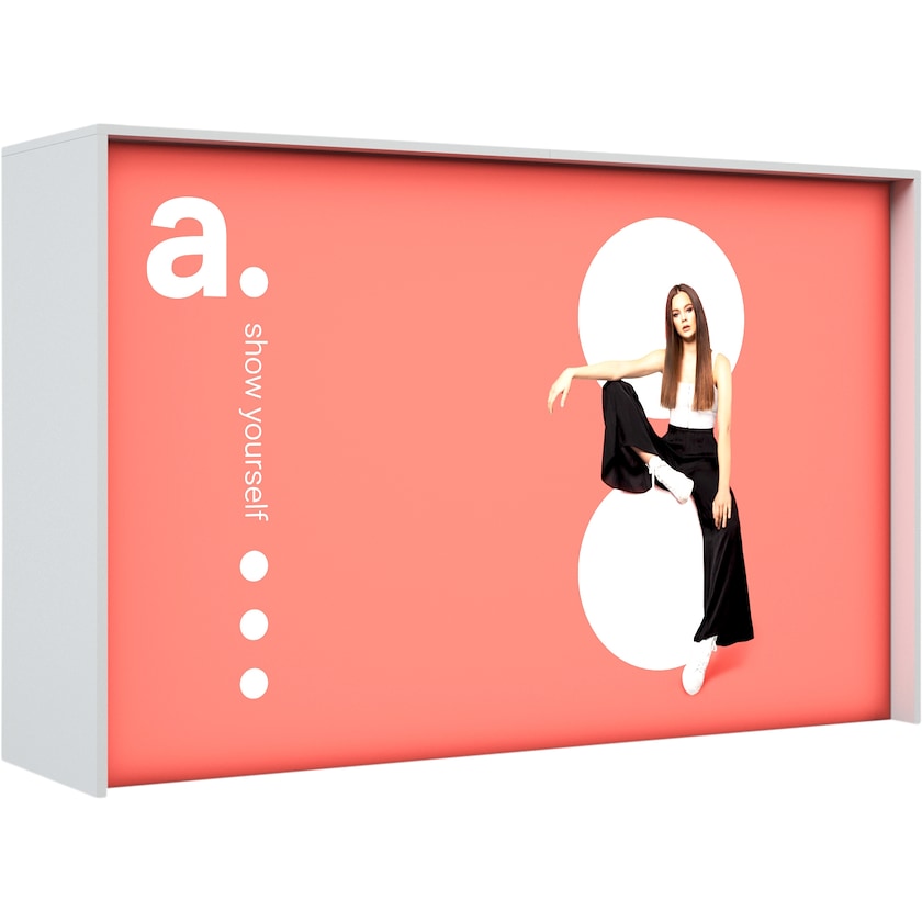 LED-beleuchteter Ausstellungstisch mit einer vollen Breite von 150 cm. Der Ausstellungstisch hat ein cleveres Design mit einem Stoffvorhang mit LED-Leuchten, die Ihr Design beleuchten. Die Montage ist sehr einfach und erfordert kein Werkzeug. Die Teile lassen sich einfach zusammenklicken. Wenn Sie das Motiv in Zukunft ändern möchten, bestellen Sie einfach einen neuen Stoff bei uns. Eine Aufbewahrungstasche mit Rollen ist im Lieferumfang enthalten.