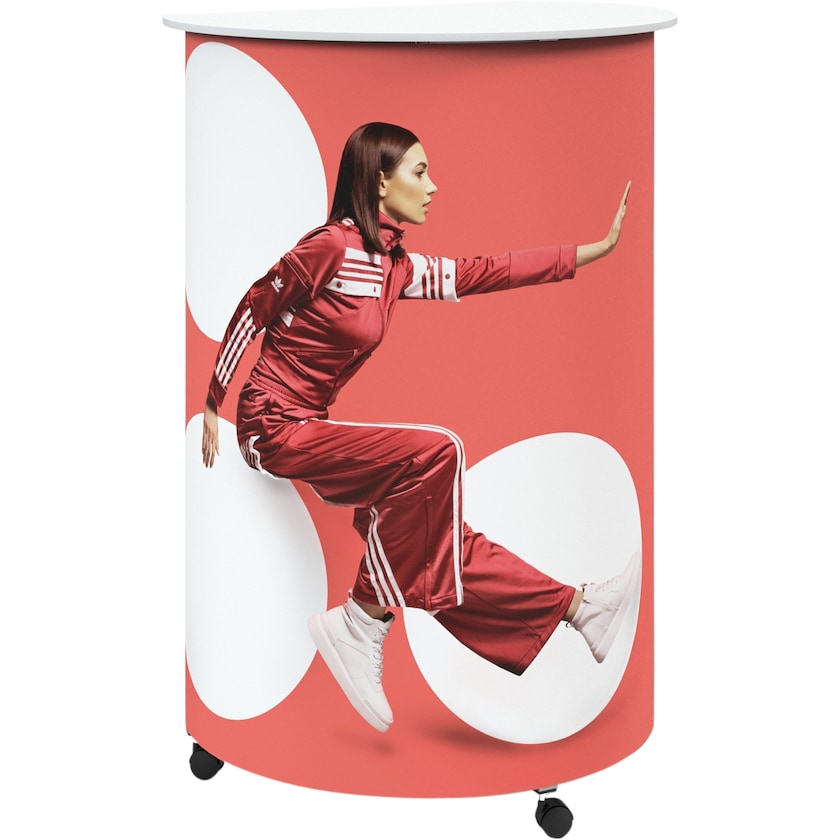 Kleiner und flexibler Ausstellungstisch mit Rollen. Der Ausstellungstisch lässt sich einfach und intuitiv zusammenbauen, indem der Stoff auf die Aluminiumstruktur des Tisches aufgezogen wird. Wenn der Tisch nicht in Gebrauch ist, wird er in der mitgelieferten Tasche aufbewahrt. Er kann ein Gewicht von bis zu 100 kg aushalten. Falls erforderlich, kann der Stoff separat bestellt werden, um das Design des Tisches zu erneuern.