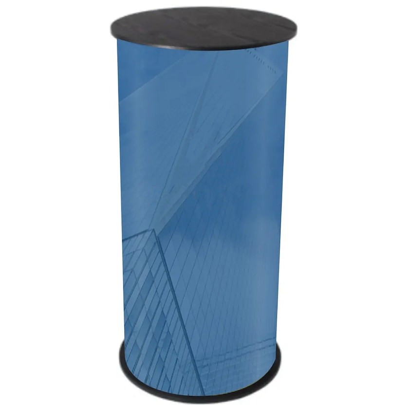 Runder Messetisch im Kompaktformat zum kleinen Preis. Expo Round besteht aus einer Holztischplatte und einer Unterseite aus klettbeschichtetem PVC. Der Druck erfolgt auf einer laminierten Folie, die über die gesamte Unterseite gelegt wird. Die laminierte Folie kann entweder glänzend oder matt sein. Der Tisch benötigt wenig Platz und eignet sich daher gut, wenn die Bodenfläche begrenzt ist. Die Tasche ist inklusive.