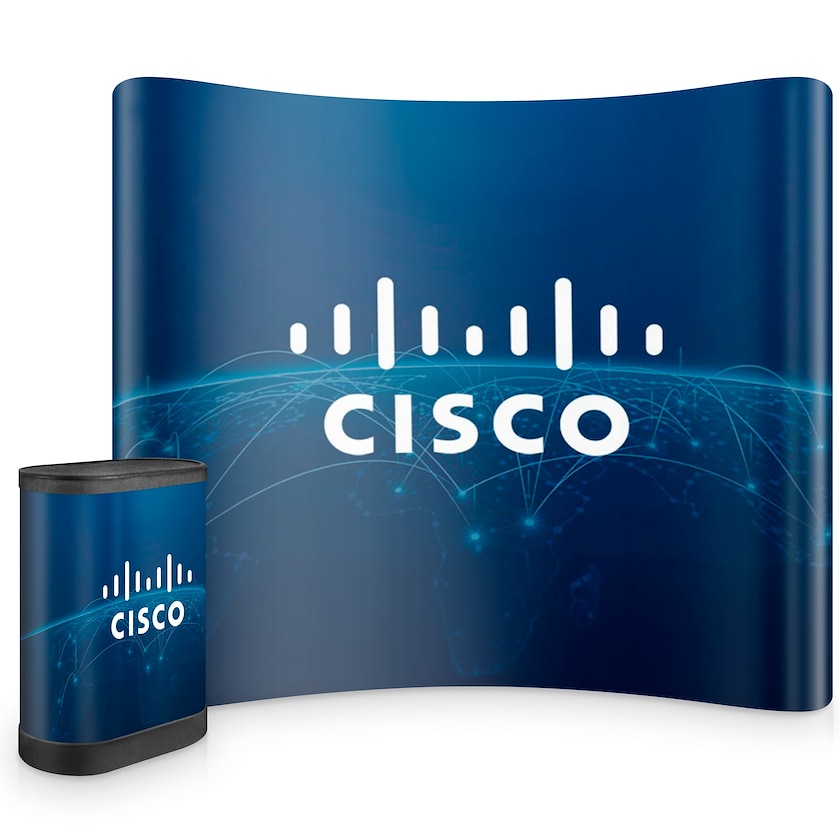 Set mit Pop Up Medium, Messetisch und Beleuchtung. Die Messwand hat eine elegant geschwungene Form. Sie kann im Handumdrehen von einer Person ohne Werkzeug aufgebaut werden. Der Stoff hält mithilfe von Magnetbändern. Der Preis umfasst das Bedrucken von Messewand und Messetisch. Der Druck erfolg bei der Messewand auf der Vorderseite und den beiden Kurzseiten. Der Messetisch hat Räder und dient auch zur Aufbewahrung.