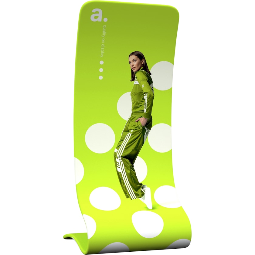 Ausstellungswand mit einer aufregenden S-Form. Die Ausstellungswand hat eine intelligente Konstruktion aus Aluminiumrohren, die zu einem Bogen zusammengefügt werden. Der Aufbau ist völlig werkzeuglos. Nachdem der Bogen zusammengebaut ist, ziehen Sie einfach den Stoff darüber und schließen ihn mit einem Reißverschluss. Der Stoff ist sowohl auf der Vorder- als auch auf der Rückseite mit umweltfreundlicher Farbe auf Wasserbasis bedruckt. Bei Bedarf kann der Stoff bei 30 Grad in der Waschmaschine gewaschen werden. Wenn Sie das Design in Zukunft ändern möchten, bestellen Sie einfach einen neuen Stoff.