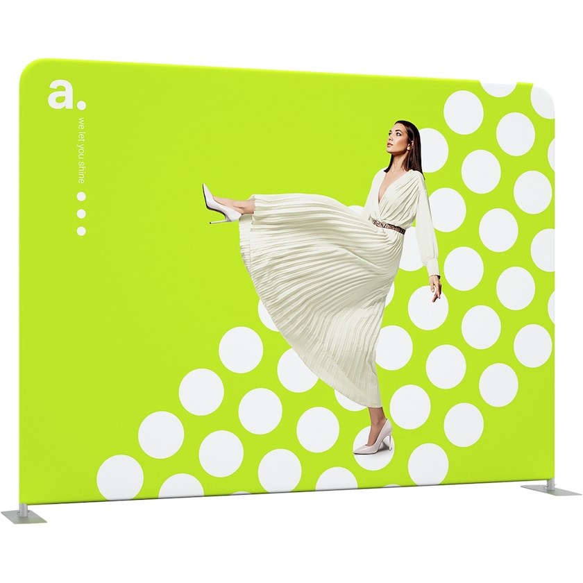 Leichte und einfach zu montierende 300 cm breite Ausstellungswand. Die Ausstellungswand besteht aus Aluminiumrohren, die ohne Werkzeug zu einem Bogen zusammengesetzt werden. Der Stoff, den wir mit Ihrem Druck liefern, wird dann über den Bogen drapiert und mit einem Reißverschluss geschlossen. Das Ergebnis ist eine Ausstellungswand ohne Knicke und Falten. Der Stoff kann in der Waschmaschine bei 30 Grad gewaschen werden. Bei Bedarf können separate Stoffe erworben werden, so dass die Motive ausgetauscht werden können. Der Druck erfolgt mit Farbe auf Wasserbasis auf beiden Seiten.
