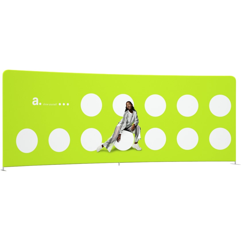 Leicht gebogene Ausstellungswand mit einer Breite von 600 cm. Die gebogene Form verleiht der Ausstellungswand einen interessanten 3D-Effekt. Die Konstruktion besteht aus Aluminiumrohren, die zu einem Bogen zusammengesetzt werden. Für die Montage ist kein Werkzeug erforderlich. Der Stoff mit Ihrem Aufdruck wird dann über den Bogen gezogen und mit einem Reißverschluss geschlossen. Der Stoff wird auf beiden Seiten mit umweltfreundlicher Tinte auf Wasserbasis bedruckt. Wenn Sie Pech haben und jemand auf den Stoff kleckert, kann er bei 30 Grad in der Waschmaschine gewaschen werden. Wenn Sie in Zukunft das Motiv der Ausstellungswand erneuern möchten, bedrucken Sie einfach einen neuen Stoff bei uns.