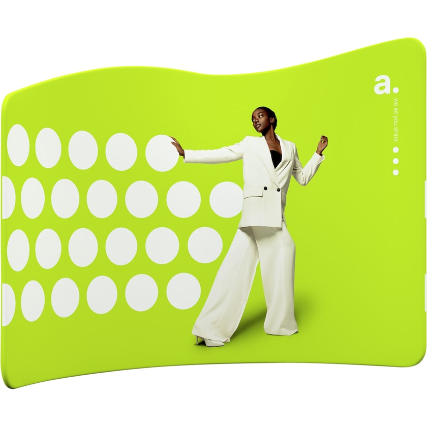Weiche wellenförmige Standwand mit 300 cm Breite. Die weiche Form schafft eine schöne Ausstellungswand für Ihre Veranstaltung. Die Ausstellungswand besteht aus Aluminiumrohren, die zu einem Bogen zusammengesetzt werden. Die Teile werden ohne Werkzeug zusammengesetzt. Sie fädeln den Stoff mit Ihrem Druck über den Bogen und schließen ihn mit einem Reißverschluss. Der Druck ist völlig umweltfreundlich mit Farbe auf Wasserbasis auf der Vorder- und Rückseite hergestellt. Wenn du den Stoff einmal waschen musst, kannst du ihn bei 30 Grad in der Waschmaschine waschen. Möchten Sie mehr Motive? Dann bestellen Sie einfach einen weiteren Stoff bei uns. Eine praktische Aufbewahrungstasche ist im Lieferumfang enthalten.