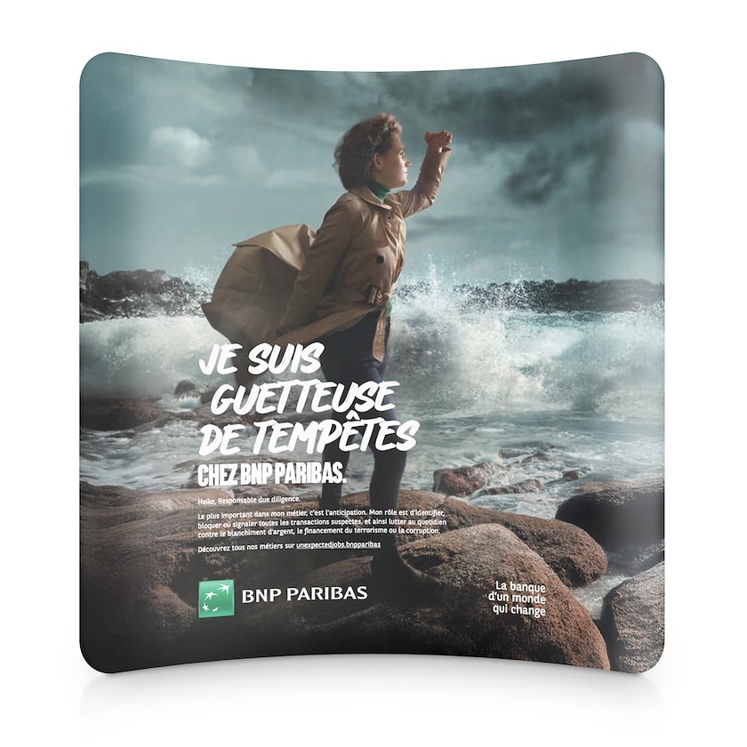 Gebogene Ausstellungswand vom Typ Softwall. Softwall Small besteht aus einem Rohrrahmen mit Aluminiumprofilen, die sich leicht zu einer weich geformten Ausstellungswand zusammensetzen lassen. Der Stoff wird über den Rohrrahmen gezogen, wodurch eine weich geformte Ausstellungswand mit unschlagbarer Druckqualität entsteht. Die Montage geht schnell und erfordert kein Werkzeug. Der Vorteil dieses Systems ist, dass Sie das Motiv einfach durch den Wechsel des Stoffes ändern können. Der Druckpreis bezieht sich auf den Druck auf der Vorderseite. Die Lieferung erfolgt in einer praktischen Tasche. 5 Jahre Garantie auf die Aluminiumkonstruktion.