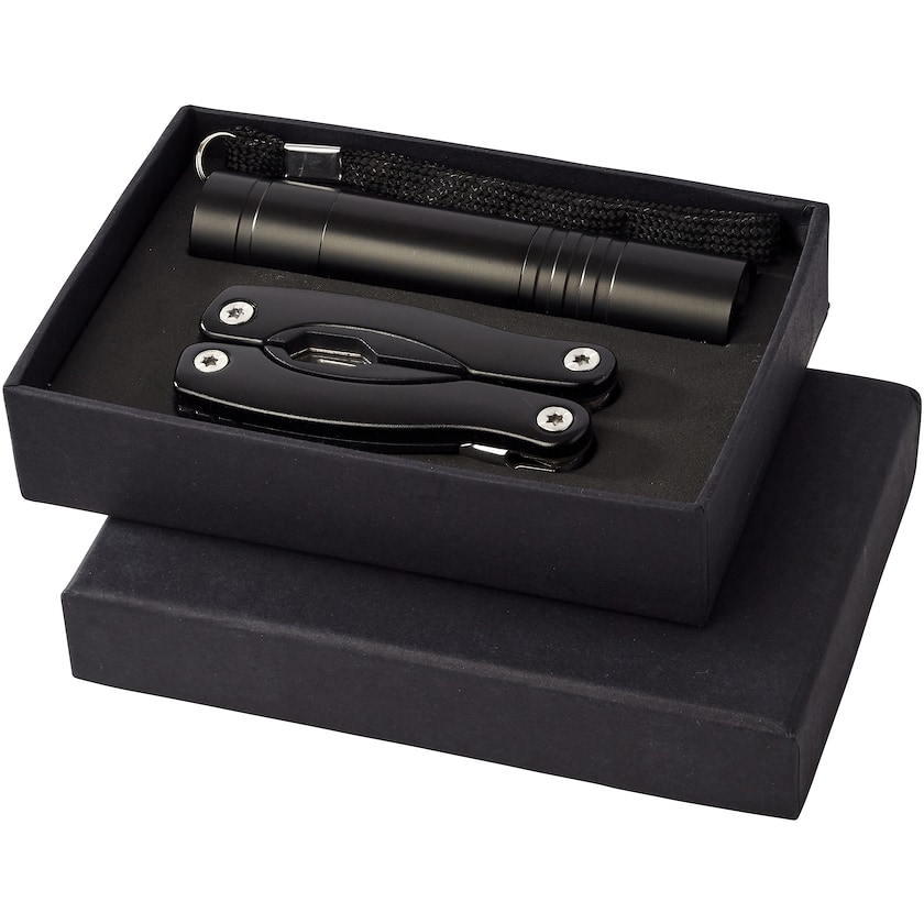 Set mit Multiwerkzeug und LED-Taschenlampe. Das Multiwerkzeug hat 11 Funktionen. Wird in einer schwarzen Geschenkverpackung geliefert. Batterien im Lieferumfang. Der Preis für die Gravur bezieht sich auf eines der Produkte.