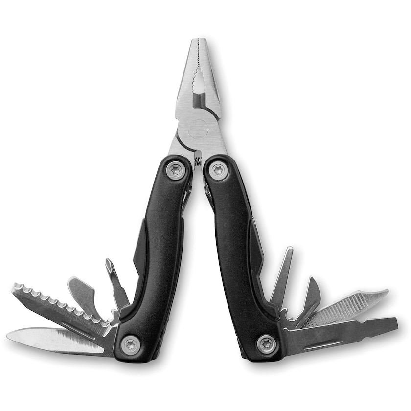 Multifunktionswerkzeug aus Edelstahl. Das Werkzeug beinhaltet 9 verschiedene Funktionen. Die Markierung erfolgt entweder mit 1-farbigem Druck oder Lasergravur.
