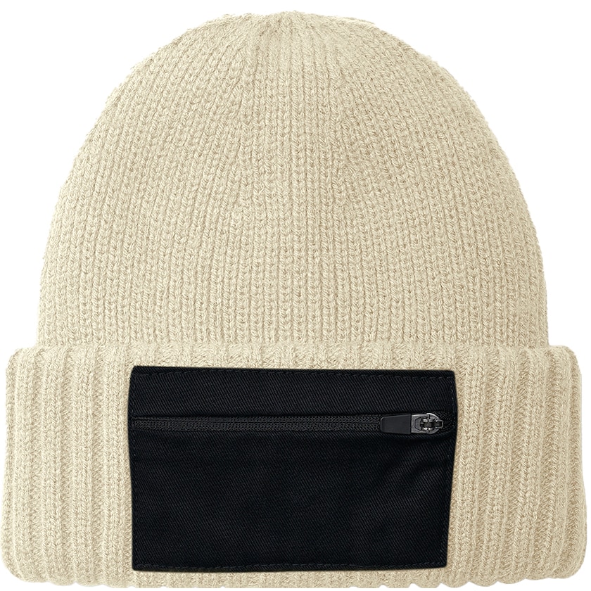 Mütze mit aufgenähter Tasche vorne. Atlanta hat einen umweltfreundlichen Stoff aus 50% recyceltem Polyester und 50% Acryl. Die Beschriftung erfolgt mittels Stickerei auf der Faltseite.