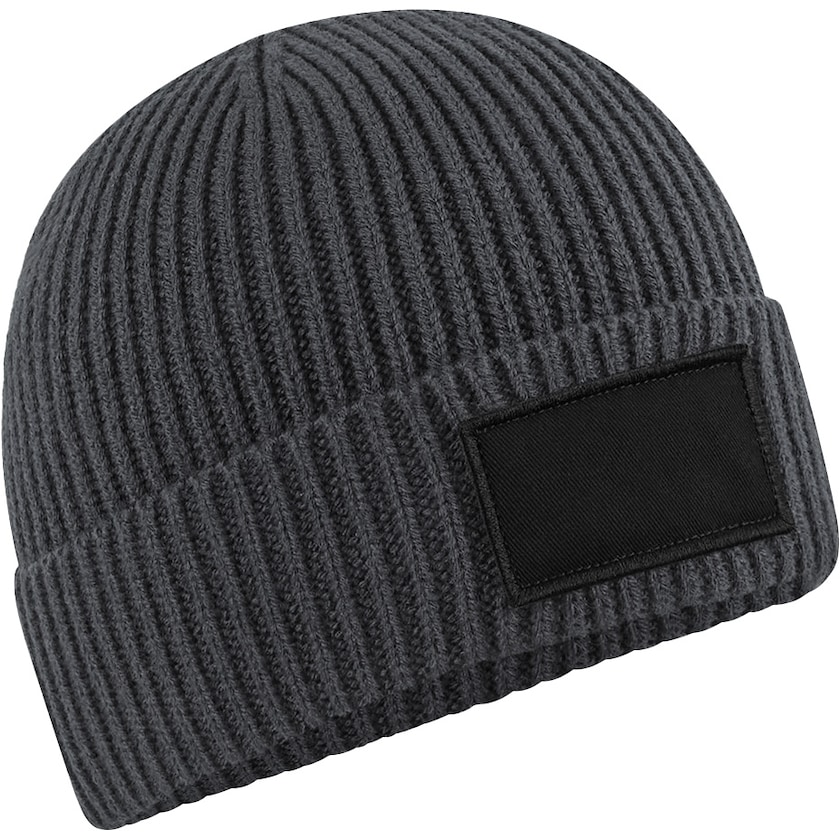 Umweltfreundliche Müze mit schwarzem Etikett und Ihrem Aufdruck. Hurst besteht aus einer umweltfreundlichen Mischung aus recyceltem Polyester, Acryl und Elastan. Das Etikett ist aus Baumwolle.