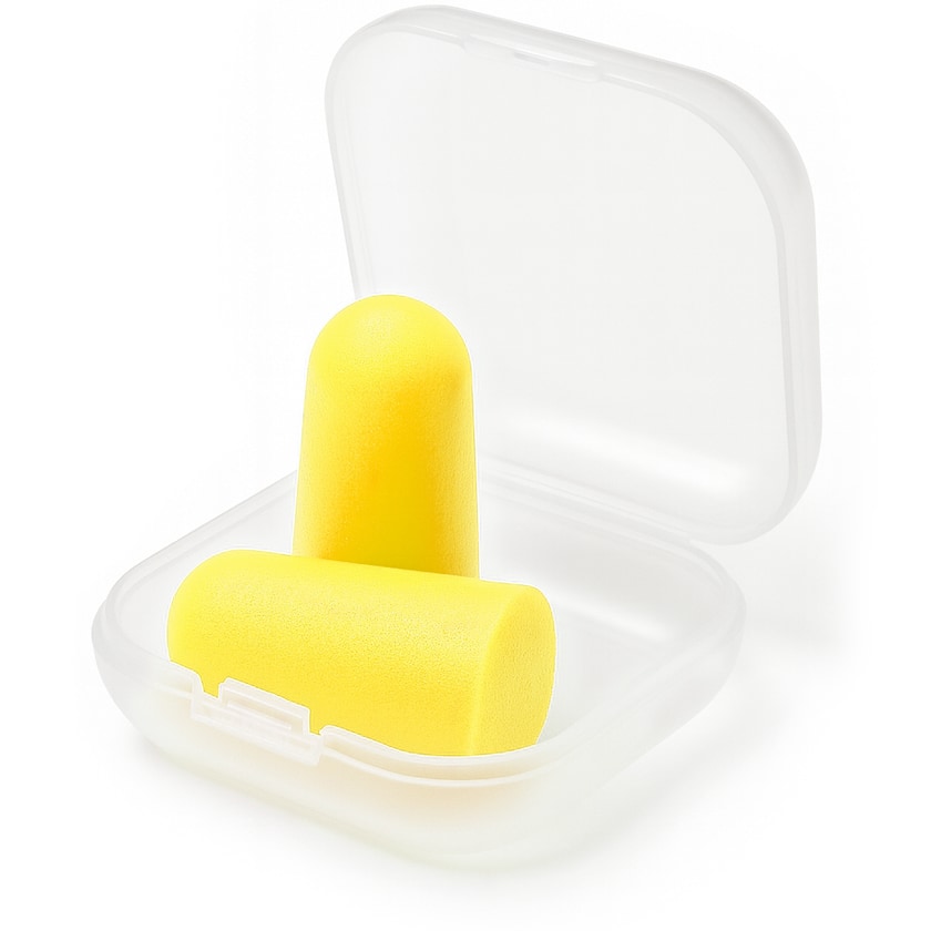 Farbige Ohrstöpsel in transparenter Plastikschachtel. Die Ohrstöpsel sind aus flexiblem EVA-Schaum und sitzen bequem. Der Druck erfolgt auf der Schachtel.