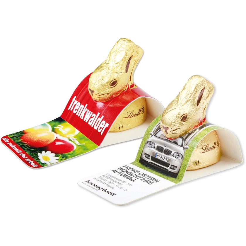 Osterhase von Lindt mit Kartonetikett mit Ihrem Aufdruck. Das Etikett besteht aus FSC-zertifiziertem Papier und wird komplett nach Ihren Wünschen bedruckt. Der Osterhase ist aus feinster Milchschokolade. Der große Liebling zu Ostern!