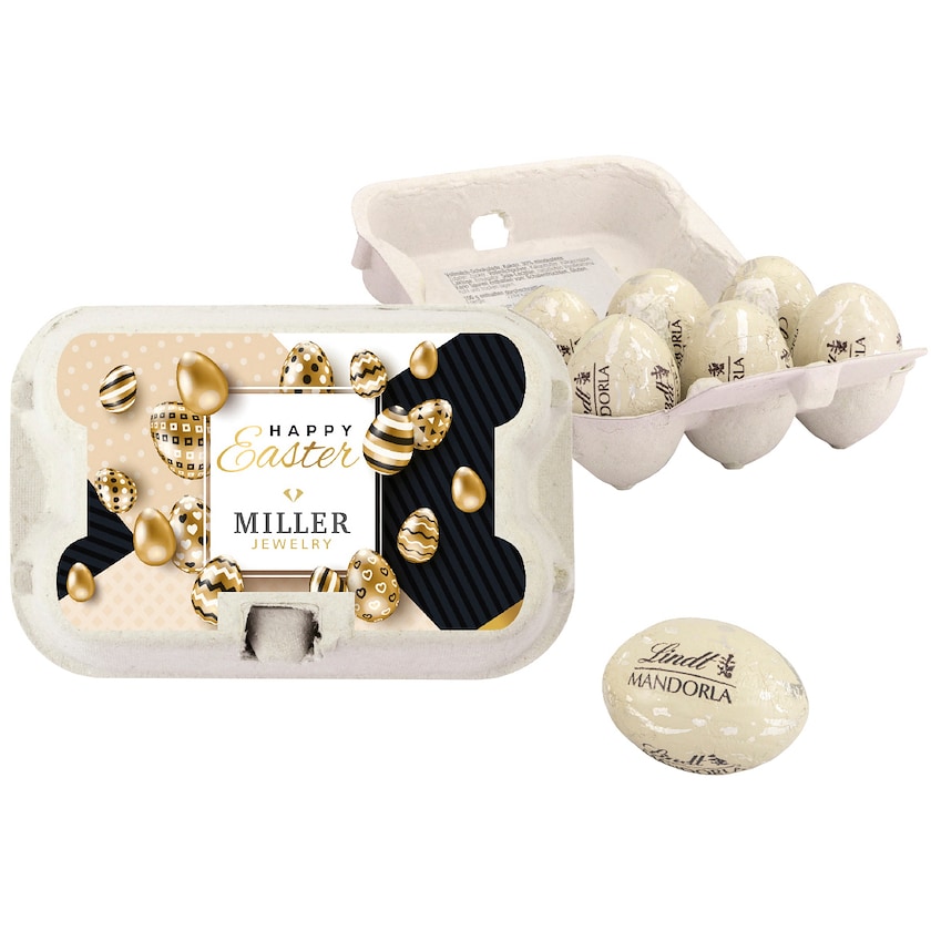 Eierkarton mit 6 Schokoladeneiern der Sorte Lindt Mandorla. Die Schokoladeneier sind mit einer leckeren Creme aus Mandelmilch gefüllt. Auf dem Eierkarton wird ein Etikett mit 4-Farbdruck platziert, dass nach Ihren Wünschen bedruckt wird.