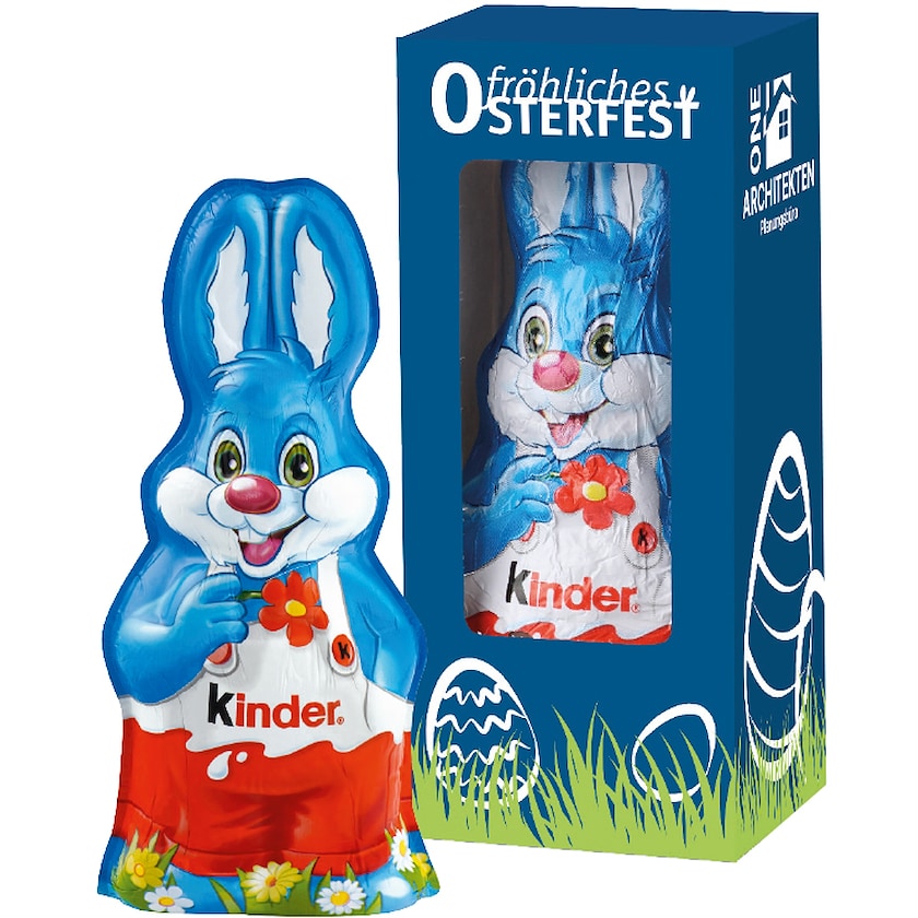 Harry the Bunny von Kinder in einer Pappverpackung mit Ihrem Druck. Ein Liebling bei großen und kleinen Kindern! Die Verpackung besteht aus FSC-zertifiziertem Papier, das klimaneutral produziert wird. Laden Sie die Druckvorlage herunter und kreieren Sie Ihre einzigartige Osternascherei!