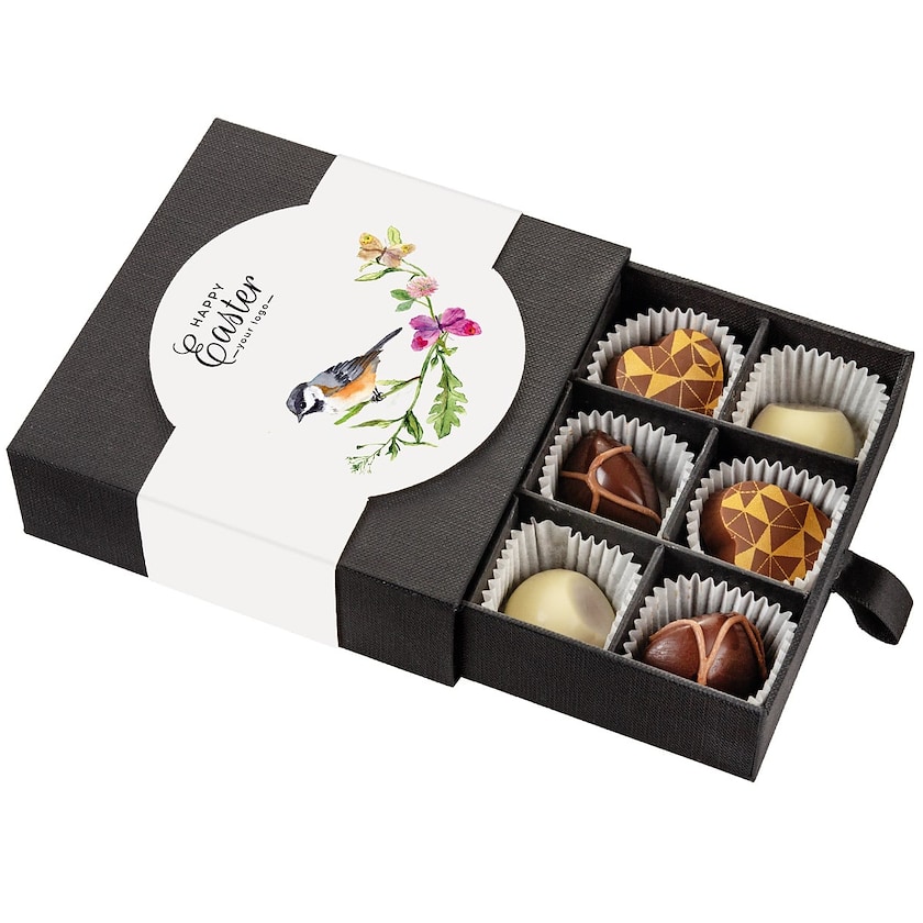 Luxuriöse Pralinenschachtel mit 9 Pralinen. Die Pralinen sind von höchster Qualität und wiegen 63 g. Eine perfekte Wahl für alle diejenigen, die eine Pralinenschachtel mit luxuriösen Osterpralinen suchen. Die Bedruckung erfolgt auf der Banderole der Schachtel.