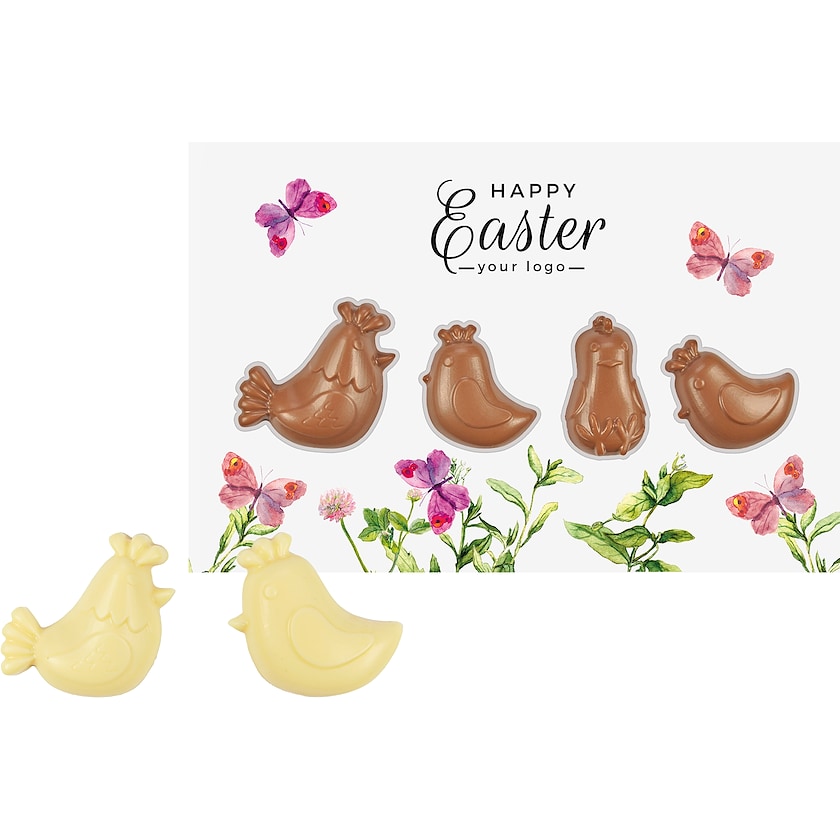 Karte mit vier Schokoladenhennen. Die Schokolade wiegt insgesamt 30 g. Wählen Sie zwischen Milchschokolade und weißer Schokolade. Die Karte wird per 4-Farb-Fotodruck bedruckt.