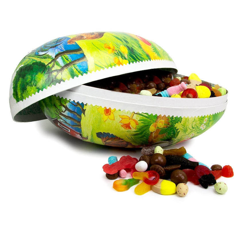 Osterei mit klassischem Motiv gefüllt mit 400 g Süßigkeiten. Enthält u. a. Brio Frukt, Zoo, Schaumeier, Ferraribilar, Lakritze, Himbeerbissen, Schokoladeneier in verschiedenen Geschmacksrichtungen, Osterschaum, dragierte Mandeleier, Salta Sill, Fruktknappar, Mintbitar und vieles mehr.