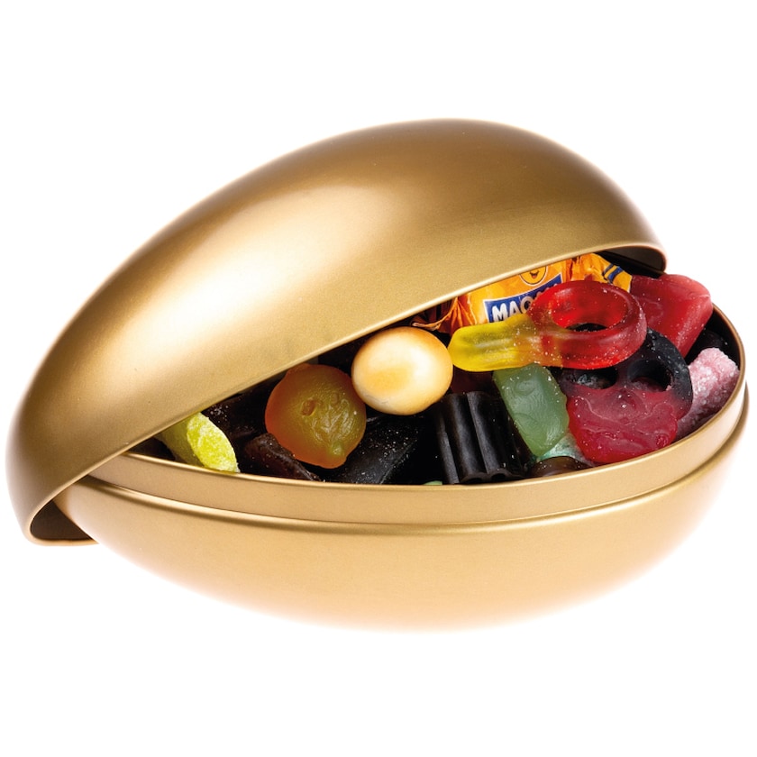 Osterei aus Metall gefüllt mit einer Mischung aus Schokolade und Süßigkeiten. Ein modernes Osterei für moderne Unternehmen!