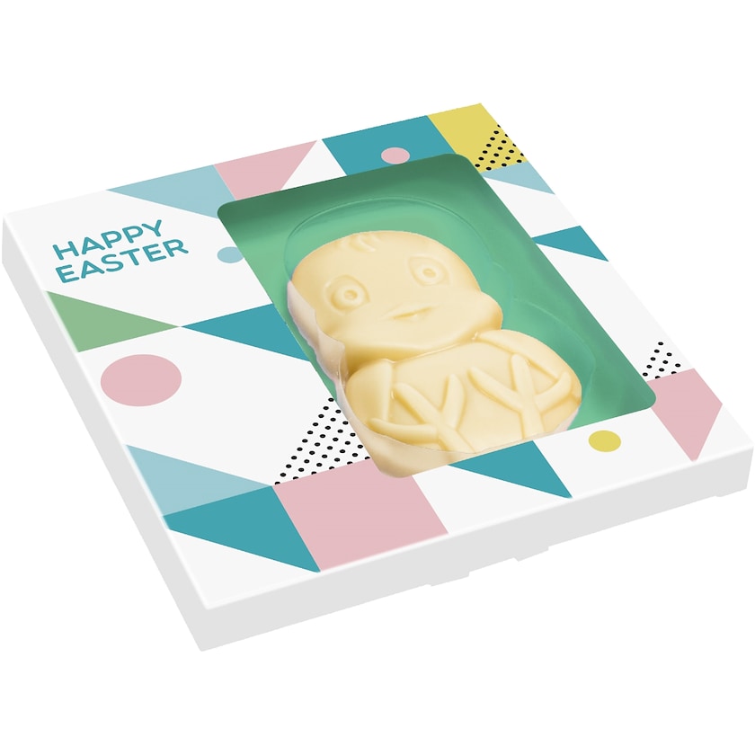 Süßes Osterküken aus Schokolade. Ihr Logo wird in eine weißes Feld auf der Verpackungsvorderseite gedruckt. Wählen Sie zwischen Milchschokolade, dunkler Schokolade und weißer Schokolade. Ein cooles Ostergeschenk für Ihre Mitarbeiter!