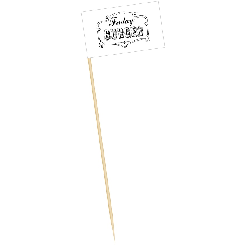 Papierfähnchen mit eigenem Druckmotiv und 15 cm langem Stäbchen für Hamburger oder Getränke. Die Fahne ist aus mattem Papier und einem Holzstäbchen. Die Fahne selber misst 30 x 50 mm und wird beidseitig bedruckt. Machen Sie ihre Hamburger zu etwas Besonderem!