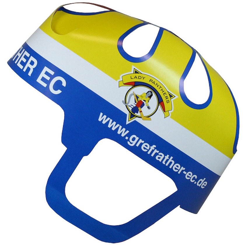 Hockeyhelm aus recyceltem Papier. Die Innenseite ist weiß und die gesamte Außenfläche wird nach Ihren Wünschen bedruckt. Geliefert wird mit echten Federn in keuchtenden Farben. Wird ungefaltet geliefert. Ein cooler Fanartikel!