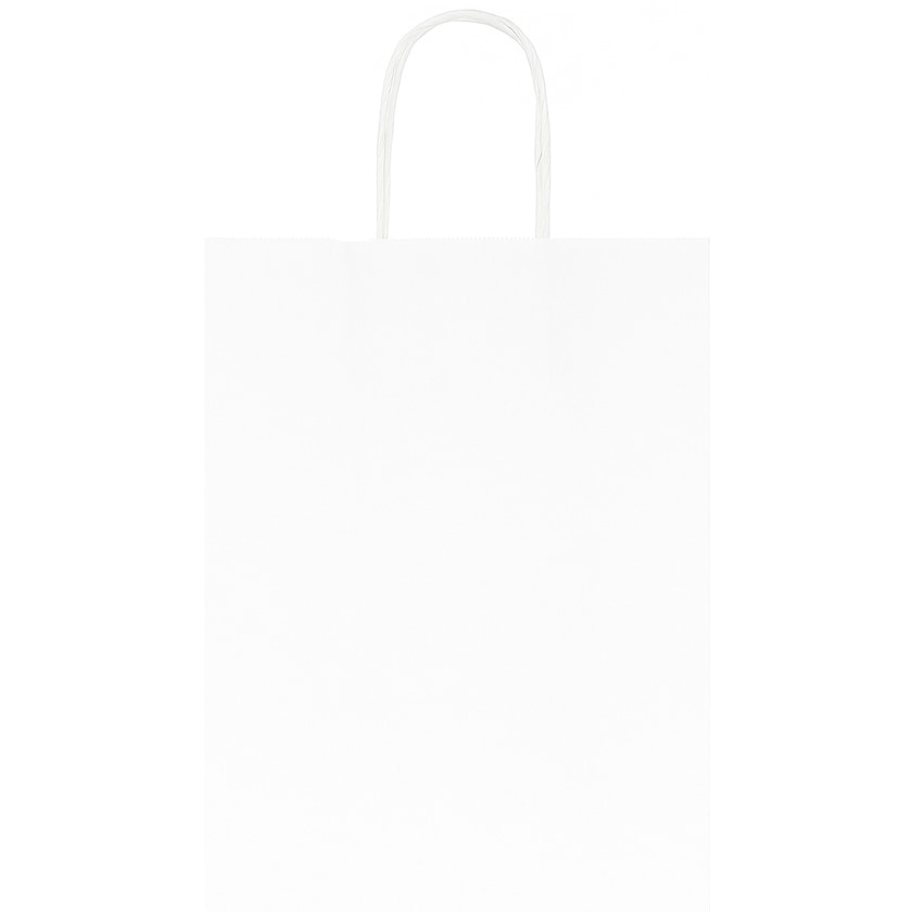 Digital bedruckte weiße Papiertüte. Die Griffe sind gedreht und verstärkt. Die maximale Tragkraft beträgt 6 kg. Der Digitaldruck ermöglicht stets eine kurze Lieferzeit der Tüten.