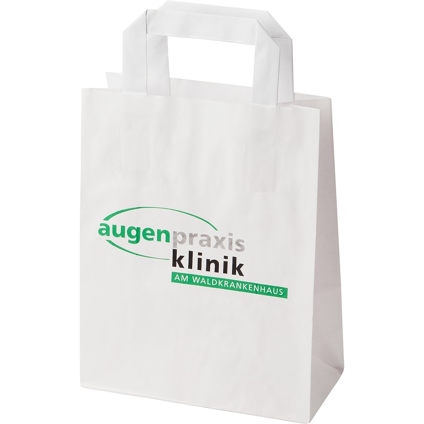 Kleine Papiertüte mit flachem Tragegriff. Die Tüte ist aus einfachem Papier. Der Druckpreis gilt für eine Seite.