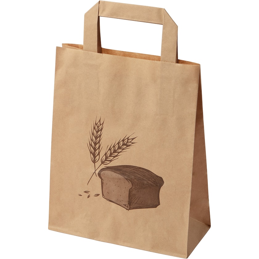 Papiertüte bedrucken, mit flachem Tragegriff. Wählen Sie zwischen braunem und weißem Papier. Der Druckpreis gilt für eine Seite.