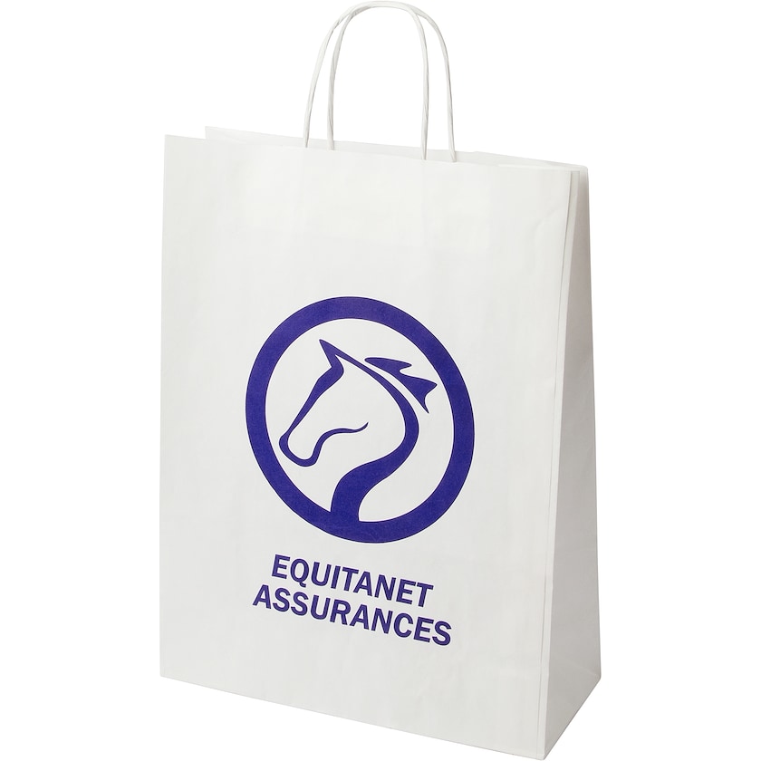 Papiertüte bedrucken, mit Kordelgriff. Die Tüte sieht schlicht aus und hat eine Tragfestigkeit von bis zu 15 kg. Der Druckpreis gilt für eine Seite.