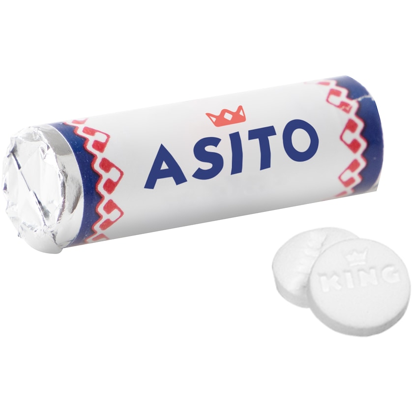Kleine Rolle mit 9 erfrischenden Minztabletten. Das gesamte Papier, das die Rolle umhüllt, lässt sich nach Ihren Wünschen bedrucken.