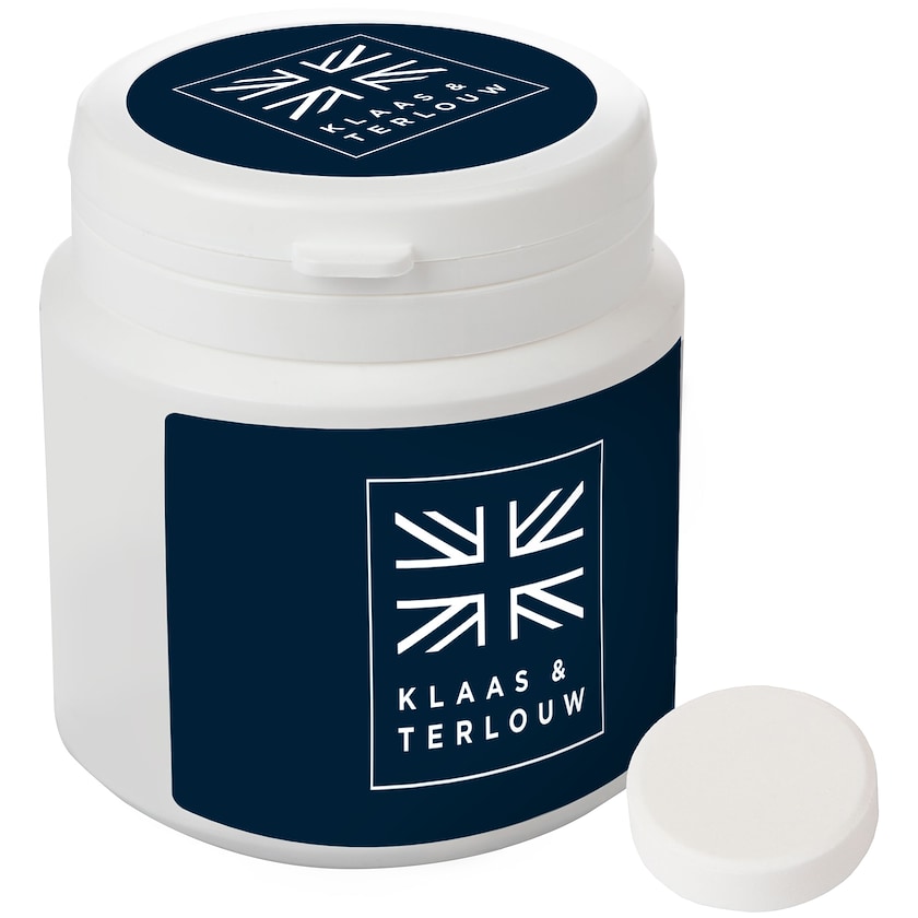 Dose mit 160 Gramm Minztabletten. Auf der Dose und dem Deckel lassen sich Etiketten nach Ihrem Wunsch bedrucken.