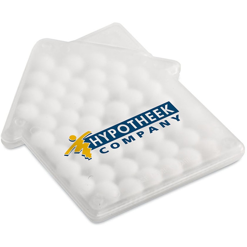 Coole Schachtel in Hausformat, gefüllt mit ca. 50 Mintpastillen.