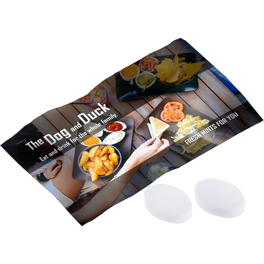 Große Verpackung mit zwei zuckerfreien Minzpastillen. Verpackung hat einen 4-Farbdruck und bietet Dank ihrer Größe ausreichen Platz für Ihre Werbebotschaft!