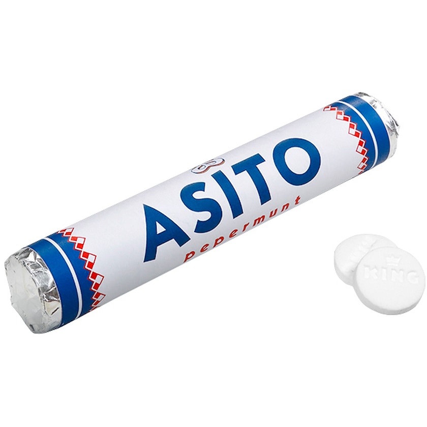 Rolle mit erfrischenden Minztabletten. Die Minztabletten sind in Silberpapier eingewickelt, dass in 4-Farbdruck gewickelt wird. Hochwertige Süßigkeit mit großer Werbefläche!