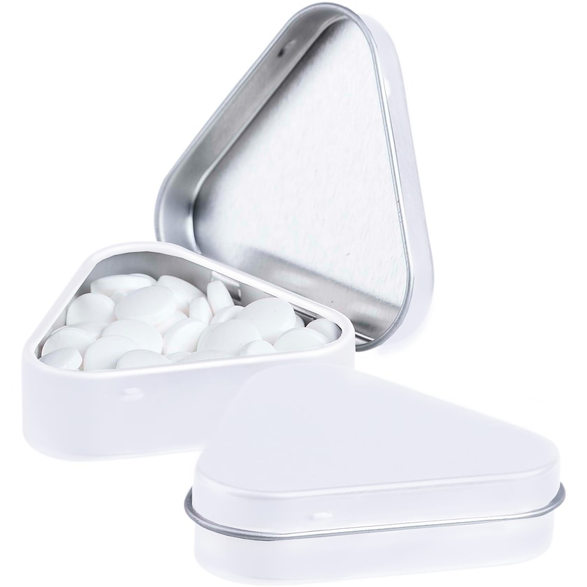 Dreieckige Metalldose gefüllt mit erfrischenden Minzpastillen. Wählen Sie zwischen normalen und zuckerfreien Minzpastillen.
