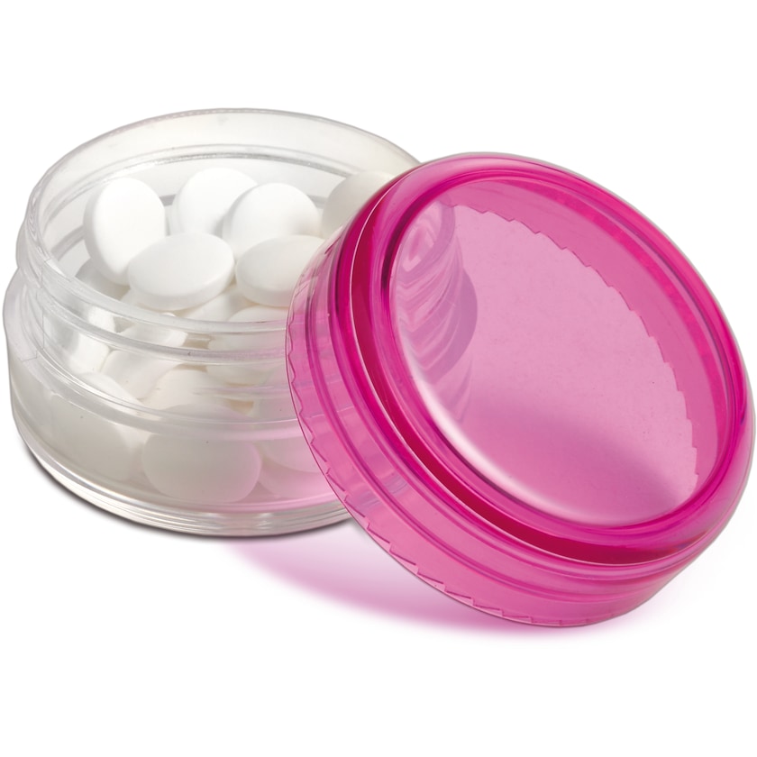 Dose mit circa 12 Gramm zuckerfreien Minttabletten. Eine hübsche kleine Dose, die viel Werbung für wenig Geld bietet.
