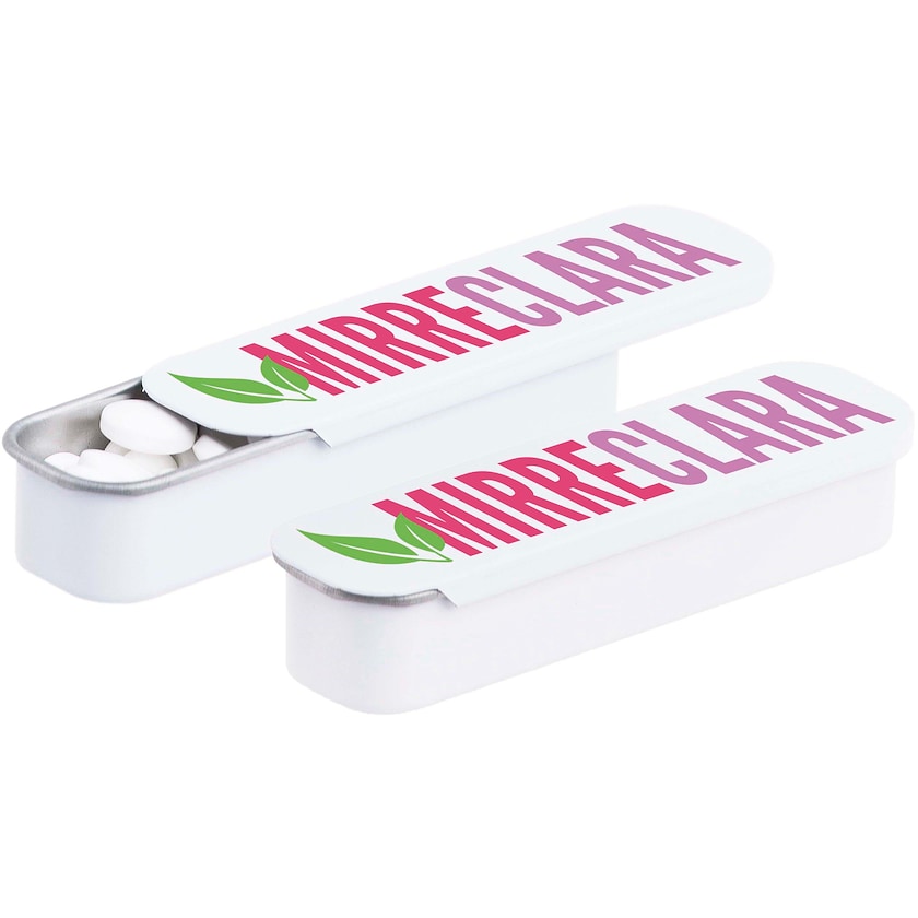 Blechdose mit 11 g erfrischenden Minzpastillen Wählen Sie zwischen normalen und zuckerfreien Minzpastillen. Der Druck erfolgt auf dem Deckel.