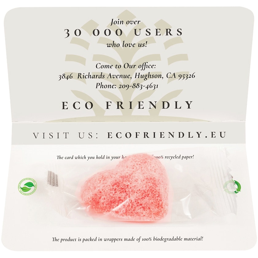 Ein Geleeherz auf einer Pappkarte. Das Geleeherz ist in einer Verpackung, die 100 % biologisch abbaubar ist. Die Karte ist perforiert und kann z. B. als Rabattcoupon genutzt werden.