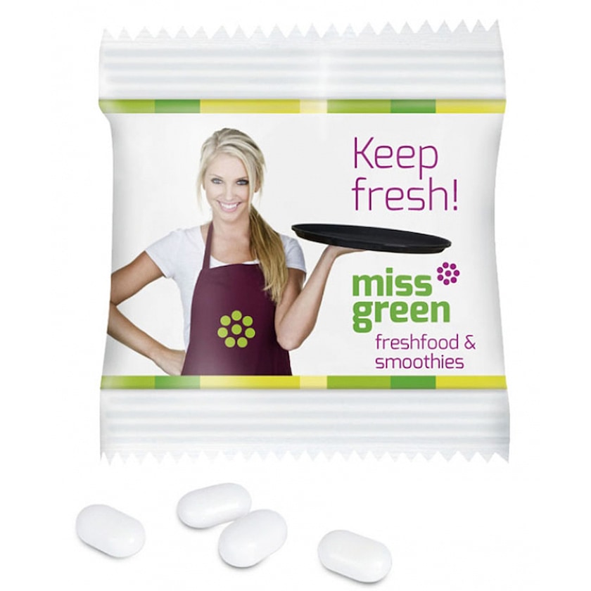 Kleine Tüte mit erfrischenden Tic-Tac. Die Tüte enthält circa 5 Gramm Tic-Tac mit Mint- oder Orangengeschmack.